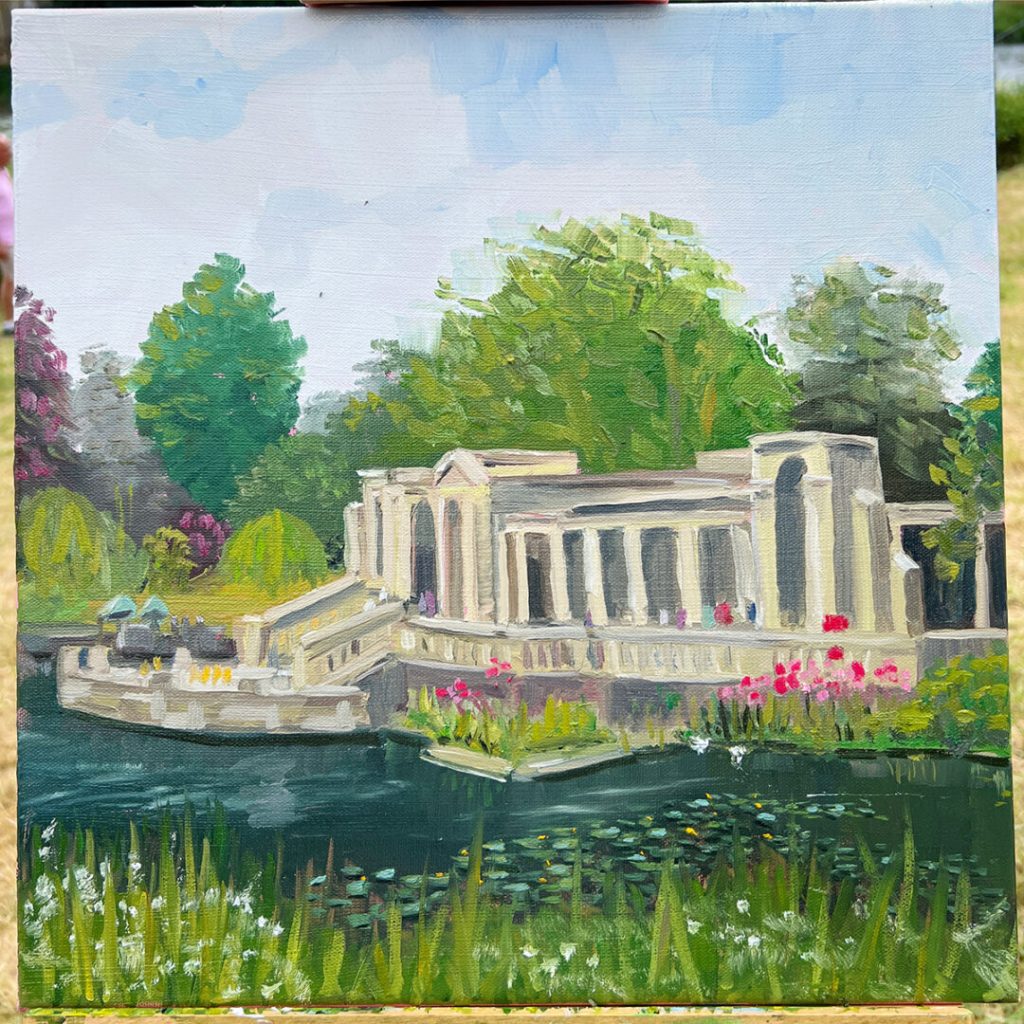 I took on the main architectural element in the view, which was possibly a mistake as it was a challenge that I could have avoided if I’d concentrated on the landscape of the lake and parkland. That said, on the day you feel like you have no time and I’m not a seasoned plein air artist, so I probably rushed to judgement a little bit.